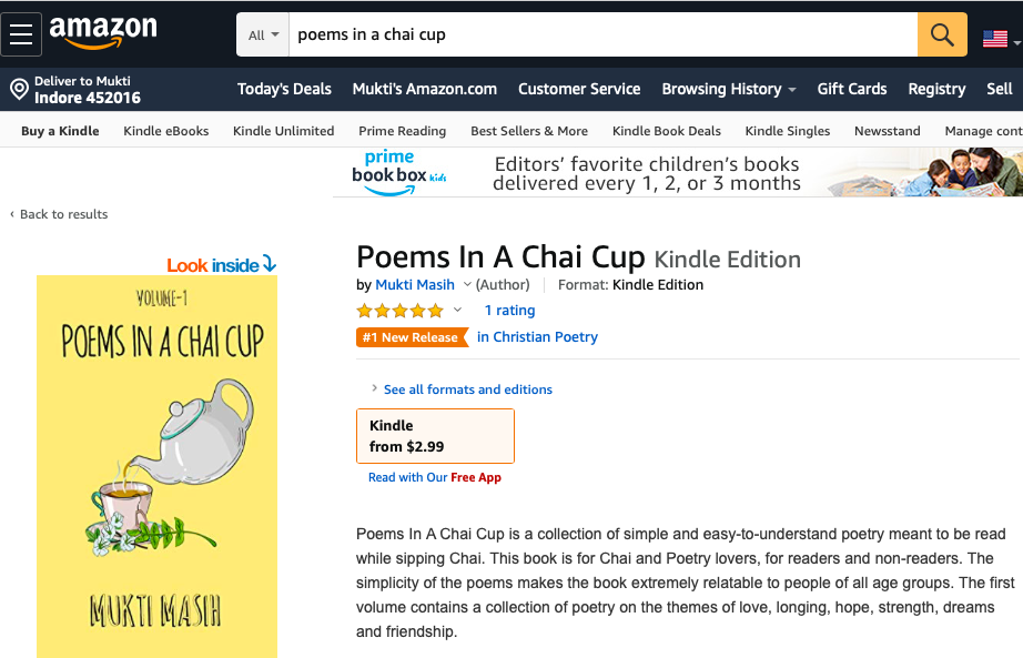 Within 24 hours of thinking this thought, I found my book as the No.1 New Release on Amazon.com. I stared at the computer screen in utter disbelief! I rushed to my parents’ room, texted my brother and we all celebrated at 1 am! I remember making “urgent chai” and then my father praying over me for the blessing.